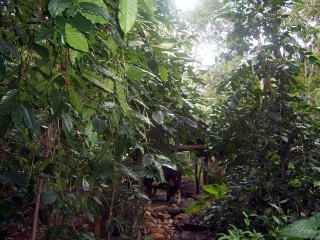 コットマレー高度1,000mを超える熱帯雨林と適度な雨、温度の高低差、肥沃な土地。しかも他の熱帯植物や樹木と一緒に繁殖し、理想的な自然の中に存在する、いわゆる天然のシェイドグロウンのコーヒーの樹々です。写真は、「幻のスリランカコーヒー」となるアラビカ種コーヒー。これから実が赤く色づき始めます。奥に牛が見えますが、分かりますか? |