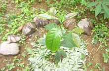 次に訪れたコーヒープロジェクトの推進役デヘミ組合長アリさんの家の庭では、パイナップル、ジャックフルーツ、バナナ等に交じって伸び伸びと育っているコーヒーの木を沢山発見!木々には緑色のつややかな実がびっしりとついていた。牛フンの山と植物の葉といっしょに発酵させる肥料小屋もある。小学生ぐらいの息子がするすると気に登って、ザボンに似た柑橘をもいでくれる。ちょっとぱ さぱさしていたけれど、素朴な味がとても新鮮だった。